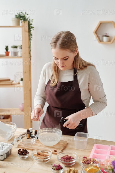 Красивая ремесленница распыляет ароматическую эссенцию в жидкую мыльную массу в миске