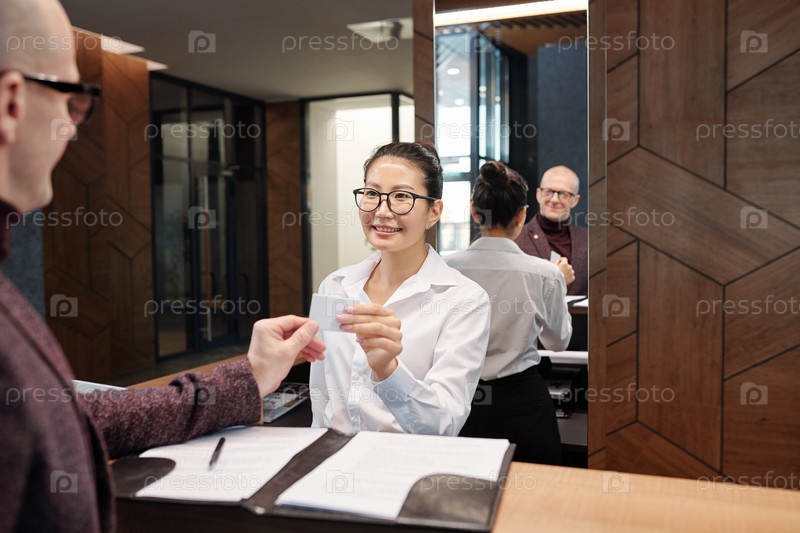 Счастливая молодая бизнесвуменка получает открытку из гостиничного номера после заполнения формы