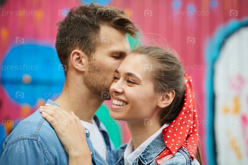 Обрезанное изображение счастливой мечтательной молодой пары, обнимающей друг друга на фоне граффити