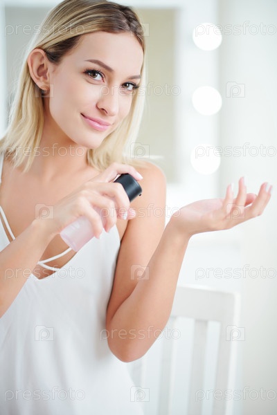Красивая женщина, наносящая спрей для тела
