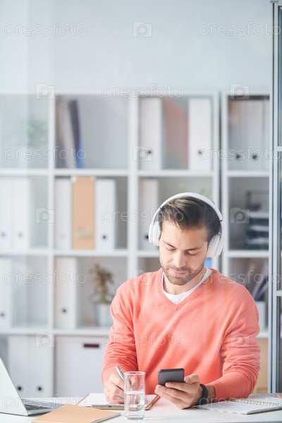 Молодой творческий сотрудник в наушниках делает заметки