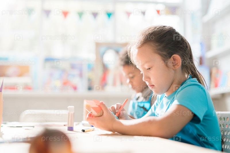 Творческая школьница сосредотачивается на создании украшений или игрушек в школе