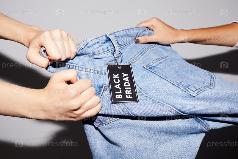 Близкий план неузнаваемых женщин, вытягивающих крутые джинсы светло-синего цвета в разных направлениях на распродаже черной пятницы