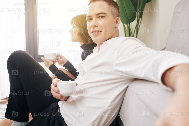 Молодая пара пьет чай дома