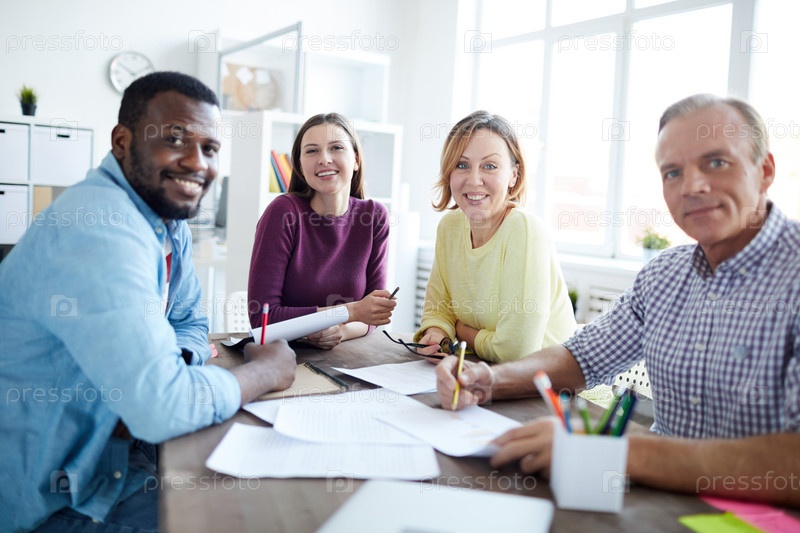 Группа позитивной мультиэтнической команды творческих дизайнеров, сидящих за столом в офисе и смотрящей на камеру во время обсуждения работ
