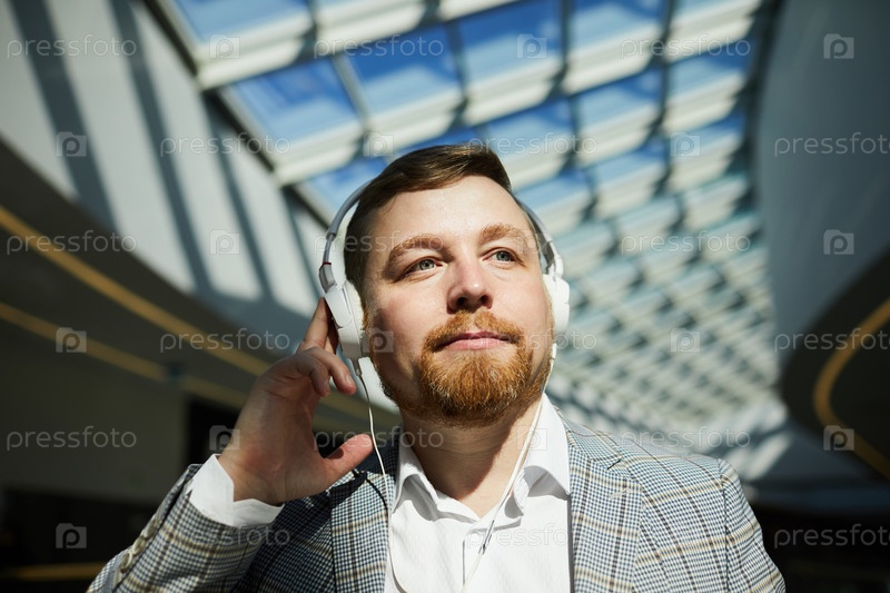 Вдохновленный мужчина слушает музыку в наушниках