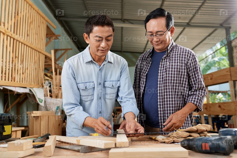 Зрелые мужчины, работающие с деревом