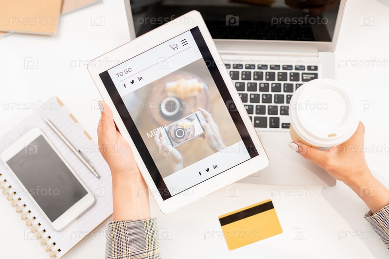 Просмотр планшета с экранохранителем интернет-магазина, который держит бизнесвумен
