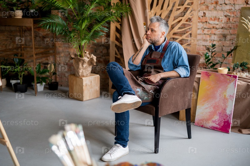 Пенсивный художник сидит перед эстафетой и смотрит на незавершенную картину