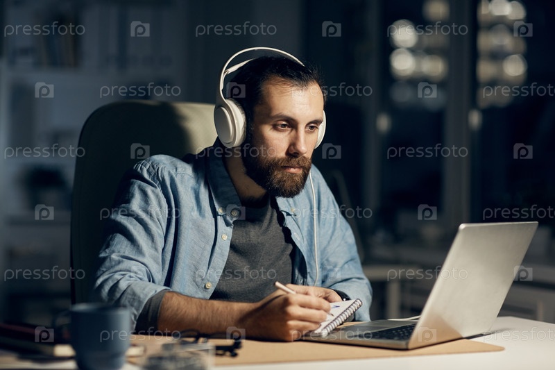 Серьезный концентрированный хипстер молодой бородатый дизайнер фильмов в наушниках сидит за столом и рисует на скетчпаде, работая до позднего вечера