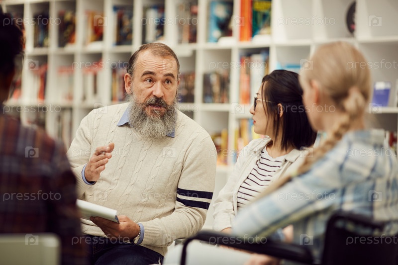 Профессиональный бородатый психотерапевт в свитере сидит в кругу студентов и объясняет, как выразить чувства на групповой терапии