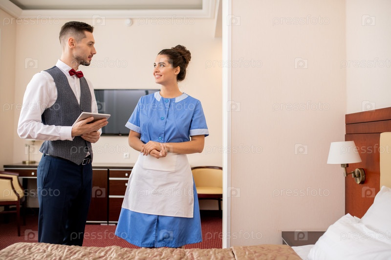 Веселая молодая горничная в униформе разговаривает с элегантным портье с сенсорной панелью