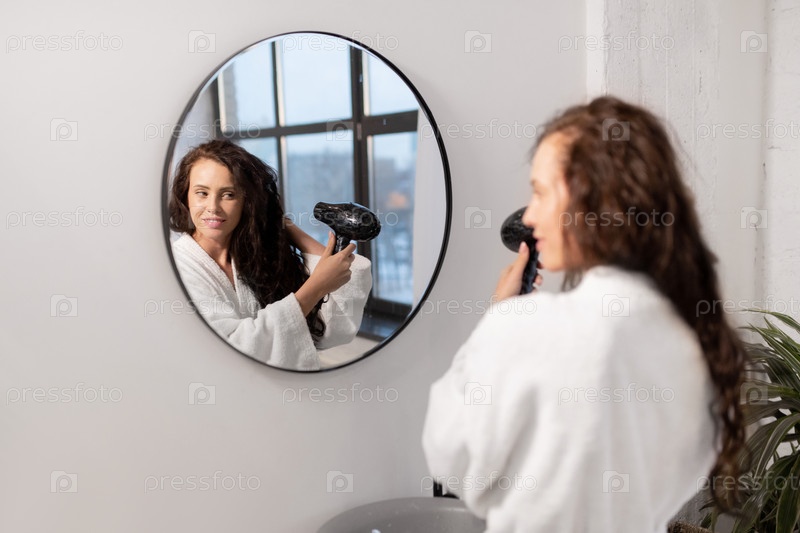 Очаровательная молодая женщина с феном, который ухаживает за ее темными длинными волнистыми волосами