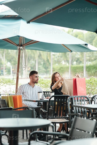 Молодая женщина показывает новый верх своему мужу