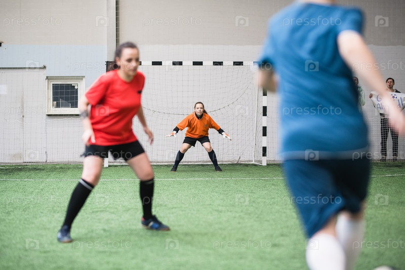 Одна из молодых активных женщин в спортивной одежде, стоящих у ворот на футбольном поле