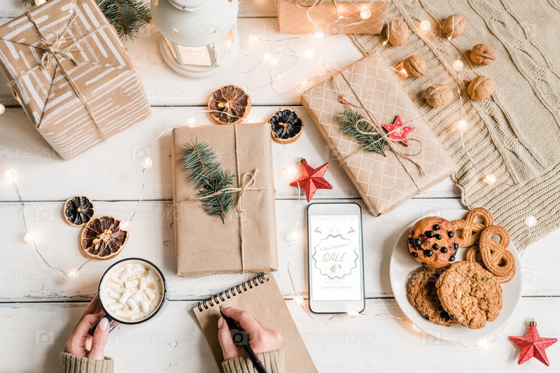 Верхний вид женских рук с ручкой над ноутбуком, держащей кружку с горячим напитком