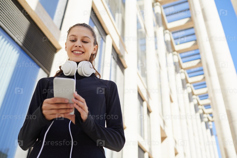 Спортивная девушка отвечает на смс-сообщения в движении
