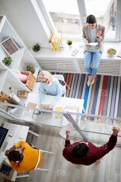Прямо сверху вид на занятых мультиэтнических людей, работающих в современном офисном кабинете