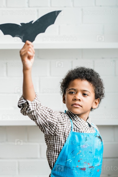 Африканский юноша в синем фартуке, держащий ручной символ Хэллоуина