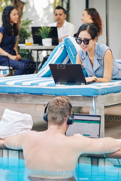 Деловая женщина, работающая у бассейна