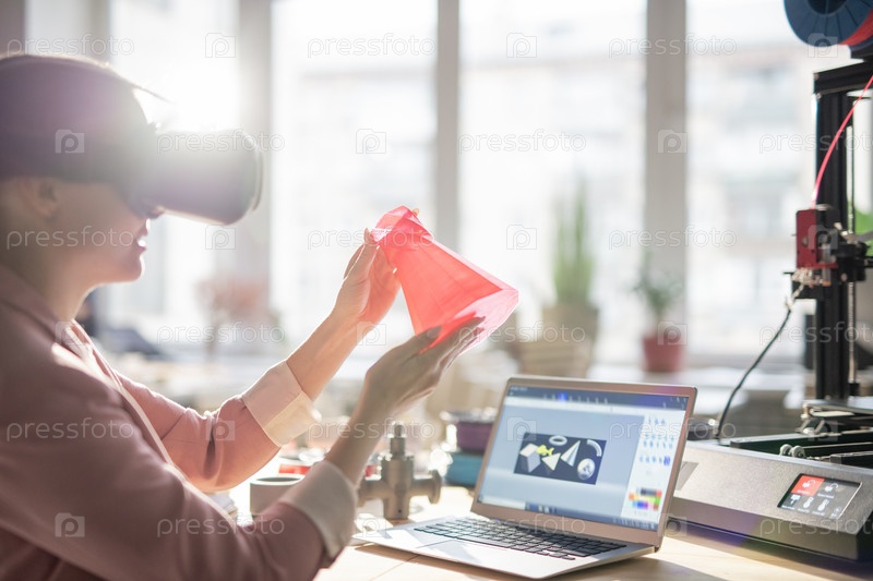 Современная молодая бизнесвумен в VR гарнитура, держащая напечатанный 3D-объект