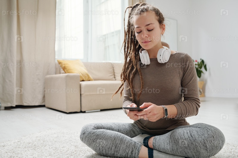 Девушка с дредольками прокручивает смартфон, сидя со скрещенными ногами