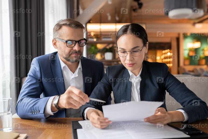 Уверенный бизнесмен указывает на контракт, в то время как его коллега-женщина читает его