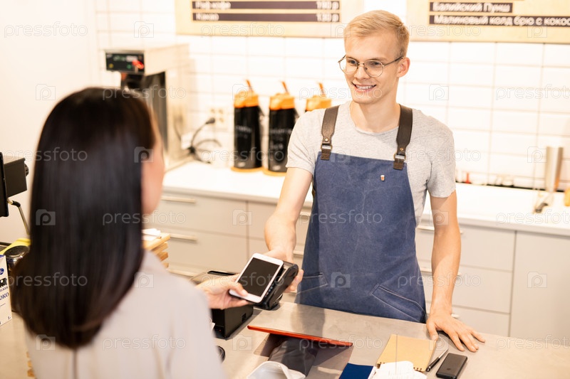 Счастливый молодой бариста смотрит на клиента, оплачивающего напиток бесконтактным платежом