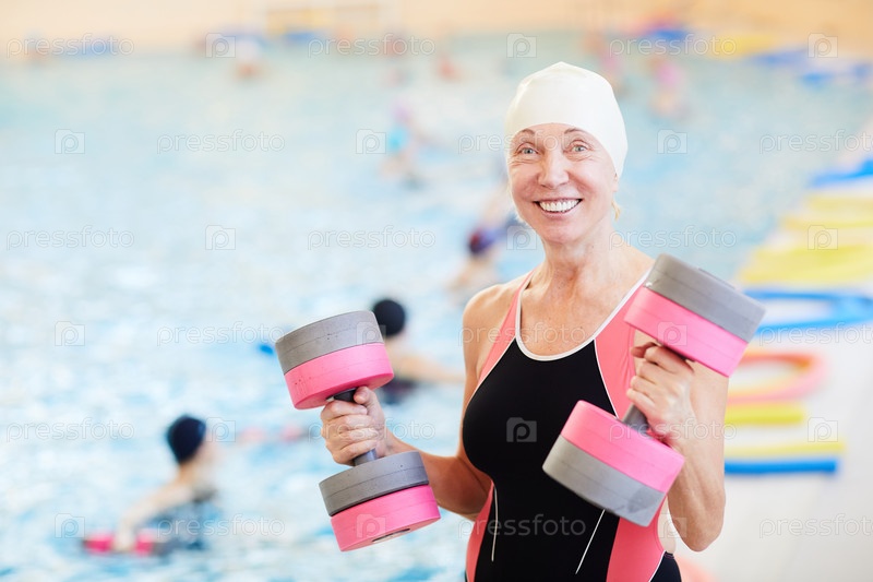 Улыбающаяся старшая женщина тренируется у бассейна