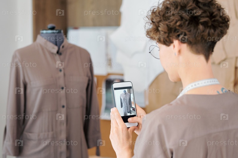 Молодая портная с смартфоном фотографирует модель куртки на манекены