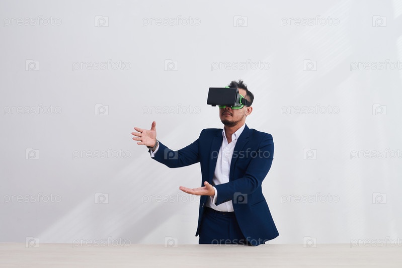 Бизнесмен в ВР стекло ловить падающие объекты
