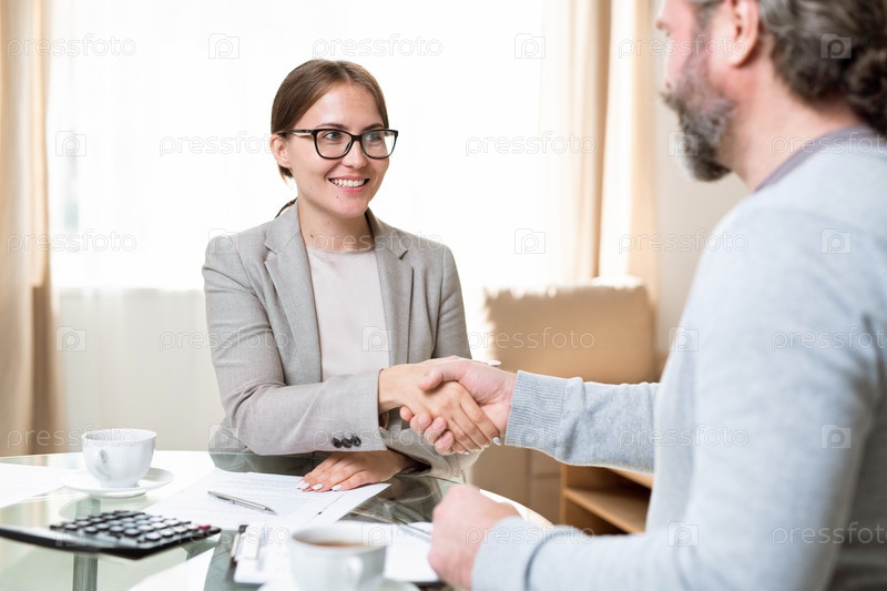 Веселый агент с зубчатой улыбкой смотрит на клиента, пока оба пожимают друг другу руки