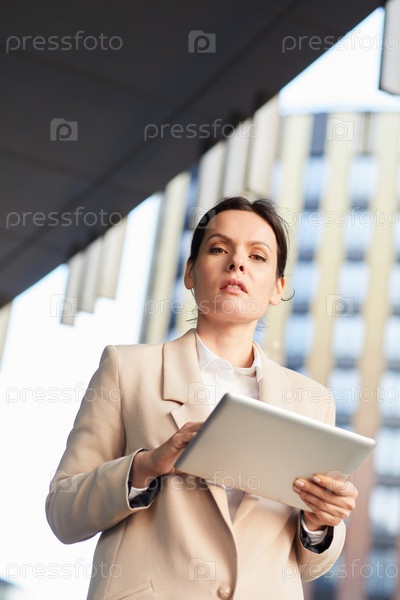 Ниже вид серьезной строгой женской бизнес-аналитики с коричневыми волосами, использующей цифровой планшет для работы во время ходьбы по улице
