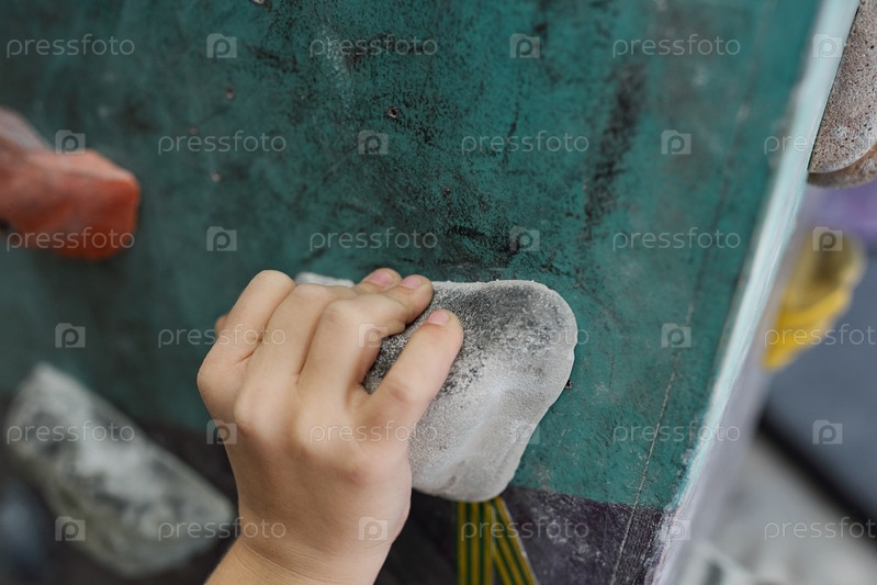 Рука школьника на одной из маленьких скал с оборудованием для восхождения