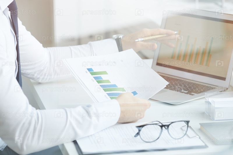 Близкий план неузнаваемого аналитика рынка, сидящего за столом и сравнивающего графики в ноутбуке и бумагах во время работы в офисе, позади стеклянного вида