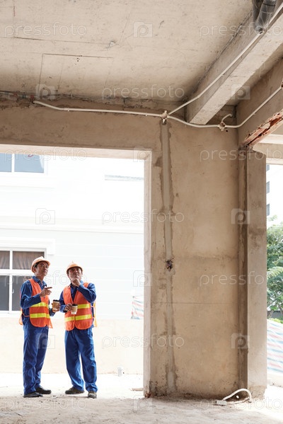 Работники обсуждают строительство потолка