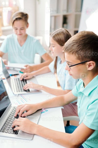 Два мальчика и девочка сидят перед ноутбуками, выполняя экзамены