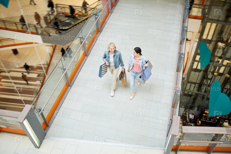 Взволнованные мать и дочь разговаривают во время прогулки по торговому центру