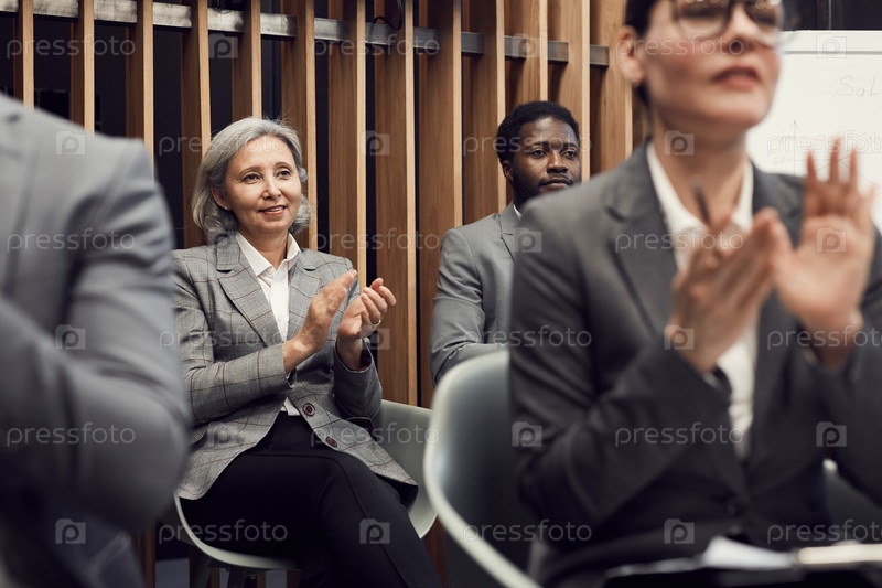Группа позитивных мультиэтнических участников конференции в формальной одежде, сидящих на офисных стульях и аплодирующих бизнес-спикеру