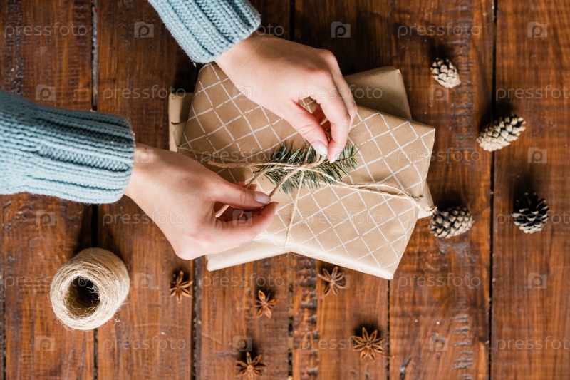 Руки девушки связывают узел на вершине коробки с подарками среди сосновых шишек и звездного аниса