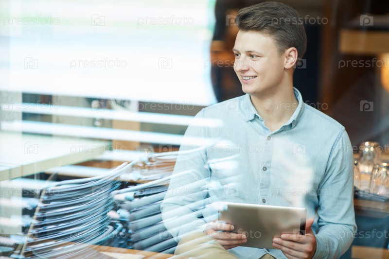 Улыбающийся красавчик, молодой специалист по социальным сетям в обычной рубашке сидит в конференц-зале и использует планшет во время презентации стратегии на встрече
