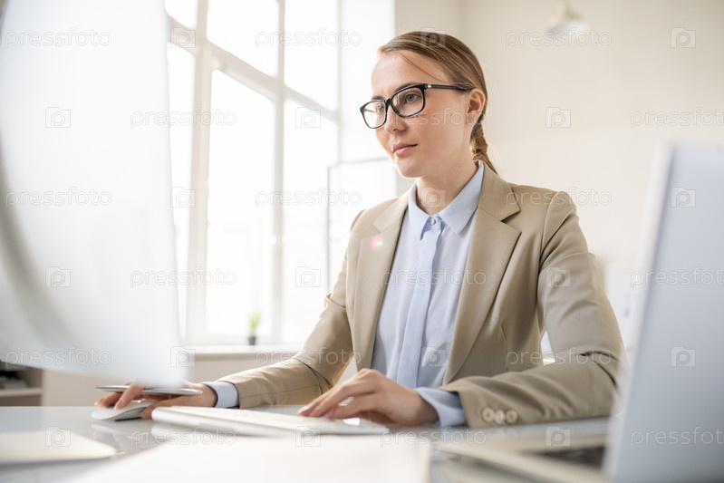 Серьезный офис-менеджер, использующий компьютер