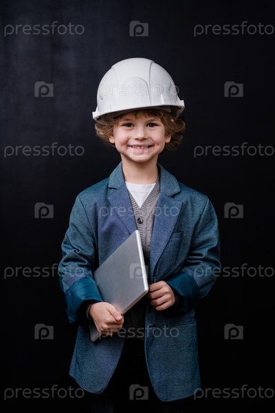Милый мальчик в шляпе и формальной одежде держит сложенный ноутбук в изоляции