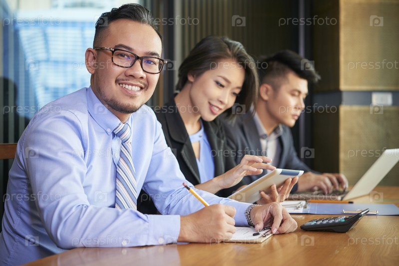 Улыбающийся предприниматель документ подачи документов