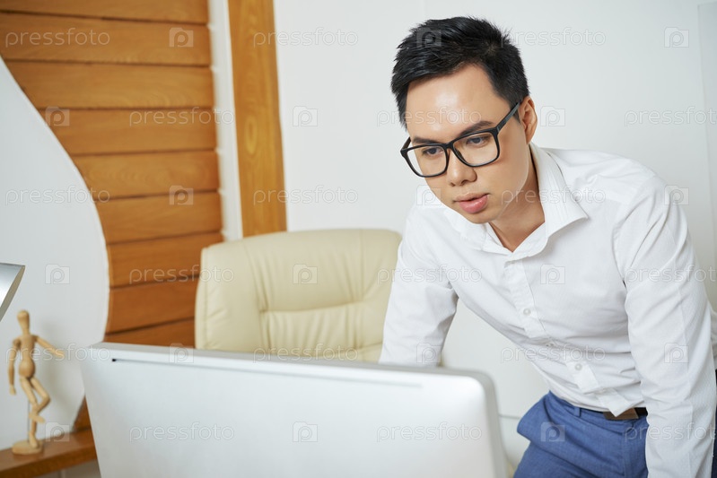 Предприниматель читает данные на экране компьютера