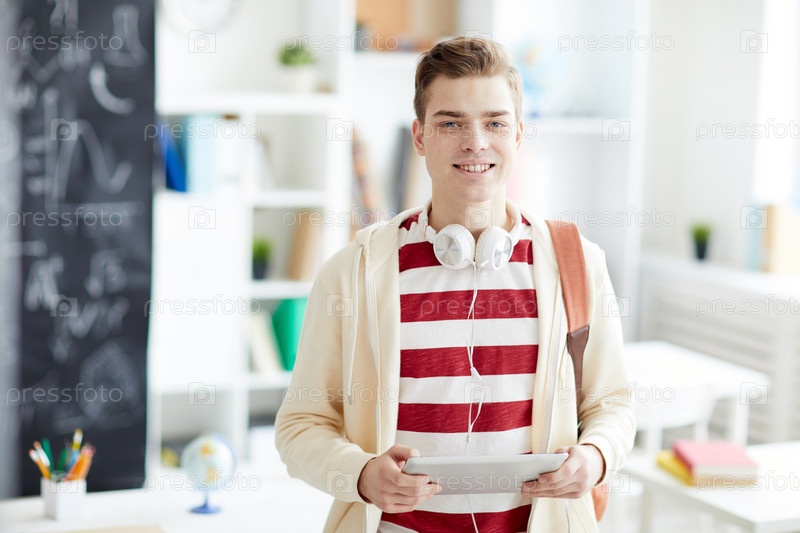Счастливый уверенный студент-мальчик с белыми наушниками на шее стоит в университетском классе и использует цифровой планшет, глядя в камеру