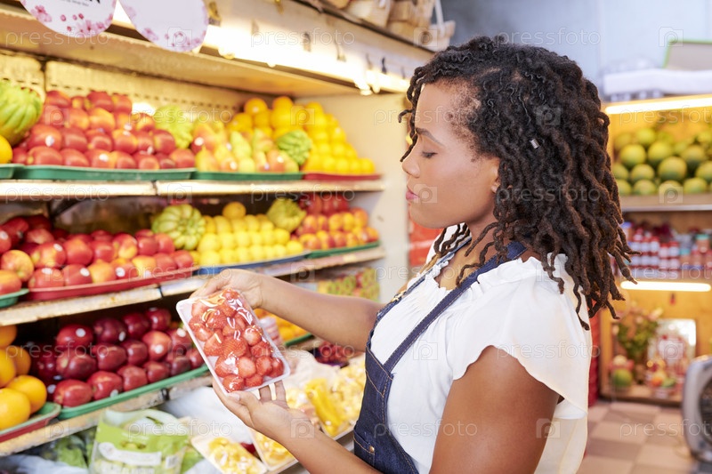 Женщина покупает свежие клубники