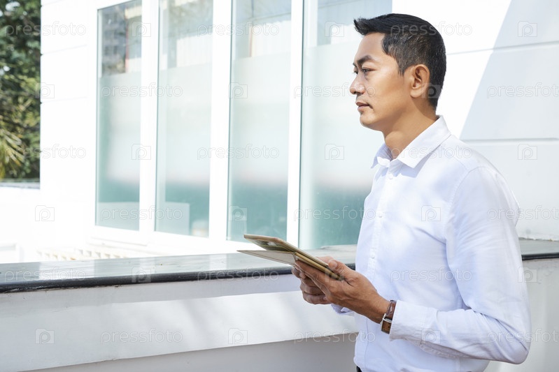 Бизнесмен, использующий планшетный компьютер на открытом воздухе