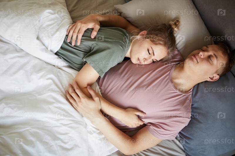 Мирные молодые супруги в футболках спят рядом друг с другом