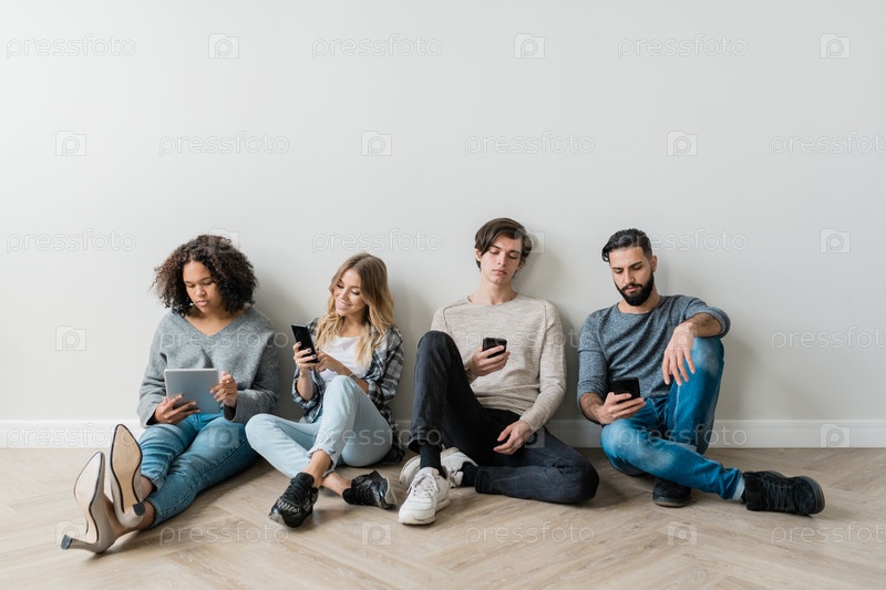 Межкультурные миллениалы со смартфонами сидят у белой стены, отправляя сообщения